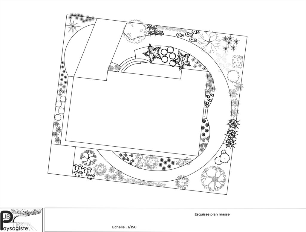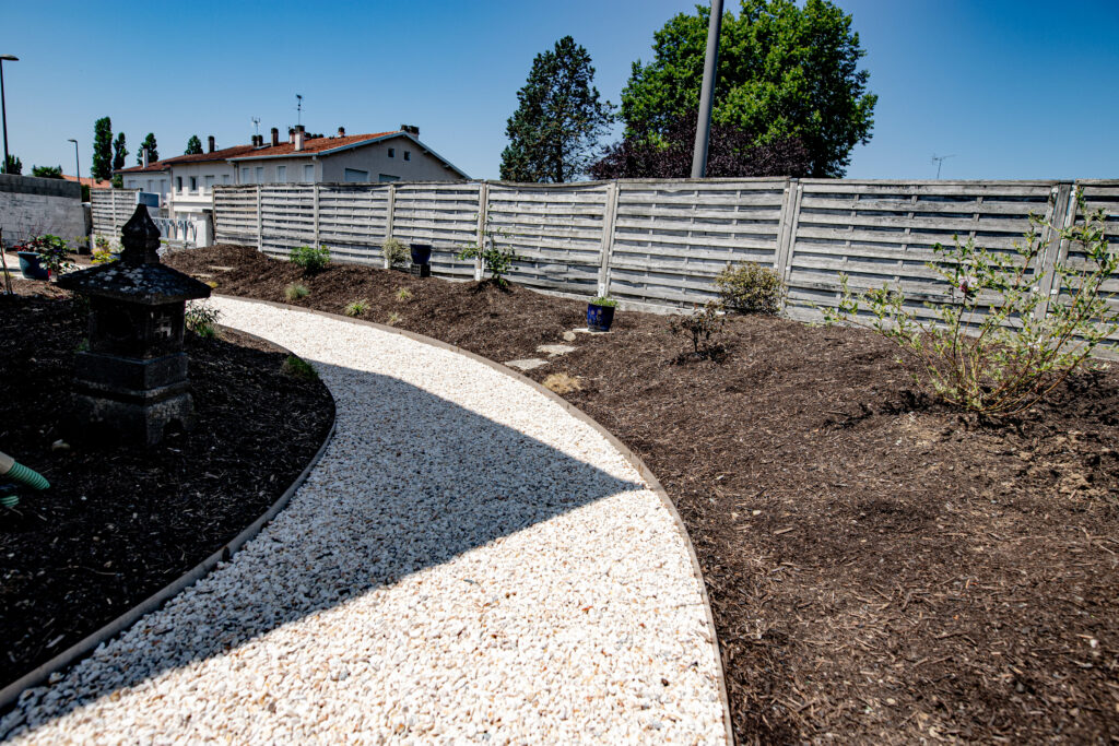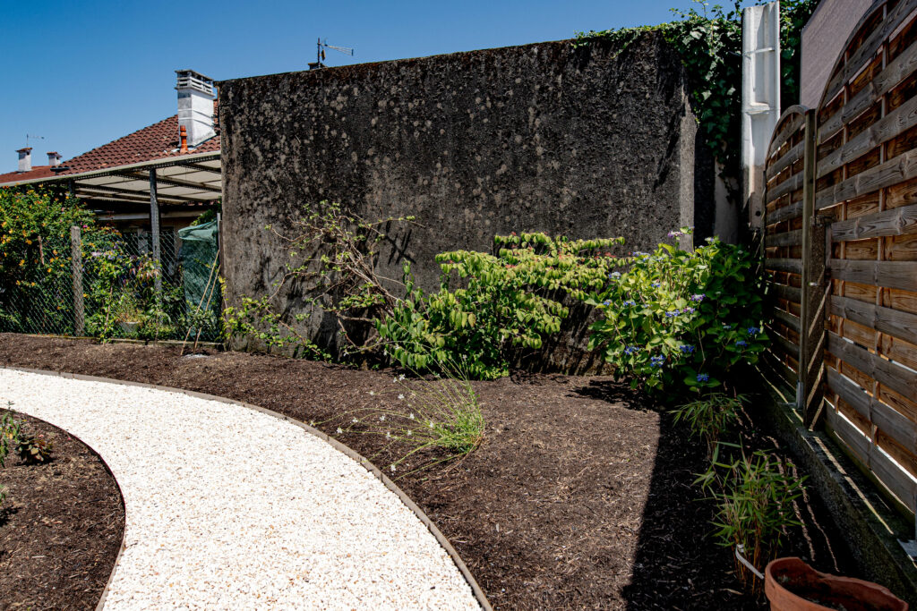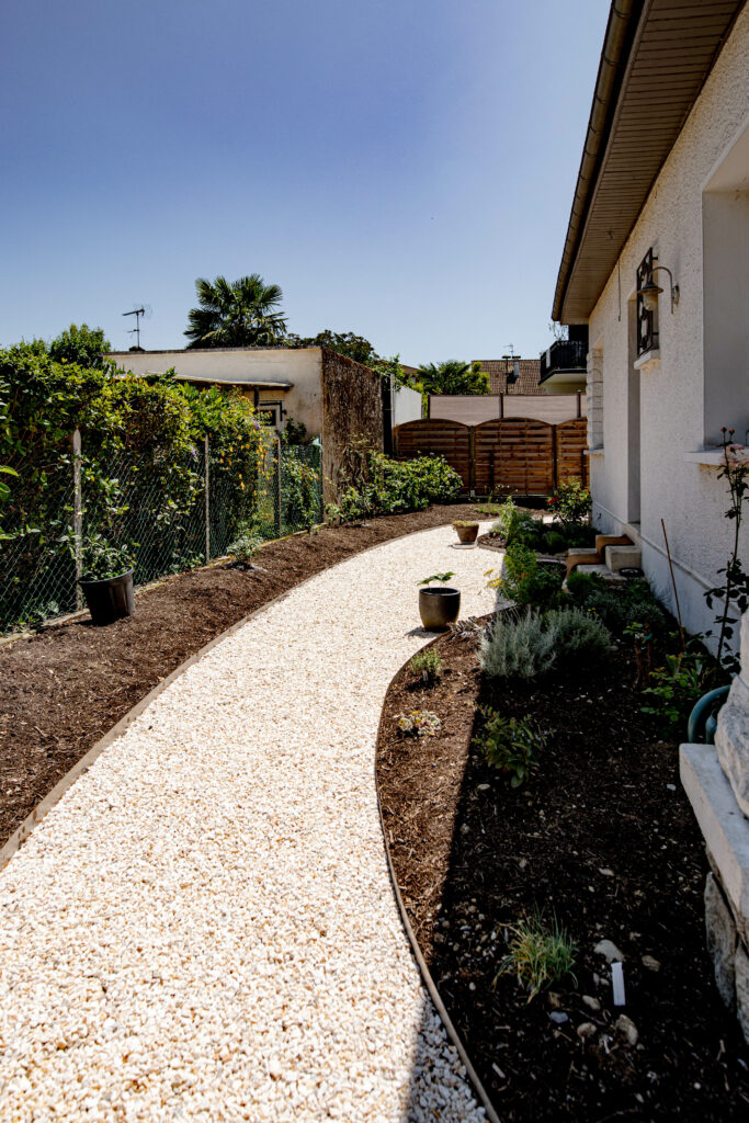 Conception et réalisation d’un jardin en cercle autour d’une maison. Réalisation d’une allée en gravier et pose de volige en Acier brute pour délimité l’allée des massifs.