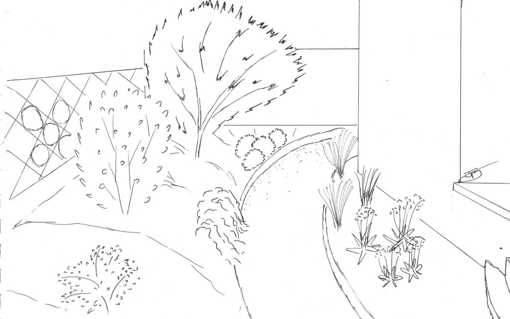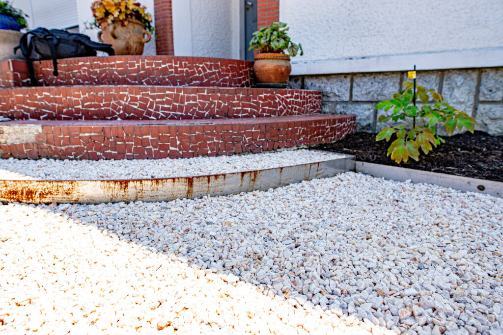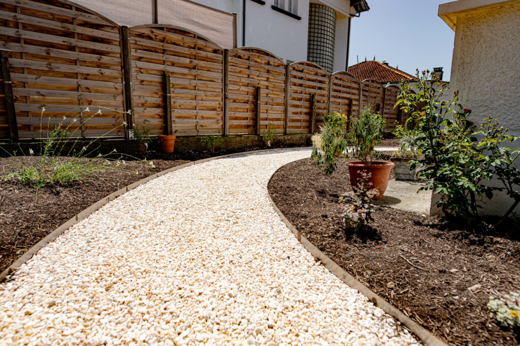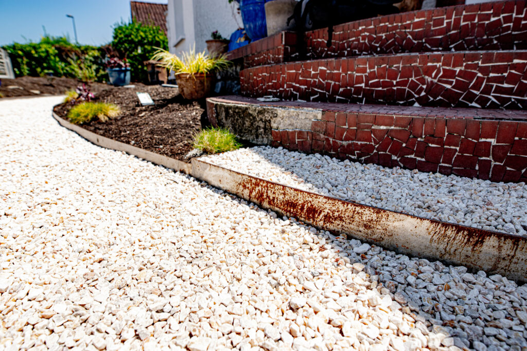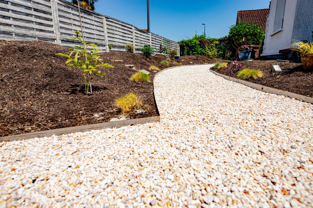 Conception et réalisation d’un jardin en cercle autour d’une maison. Réalisation d’une allée en gravier et pose de volige en Acier brute pour délimité l’allée des massifs.