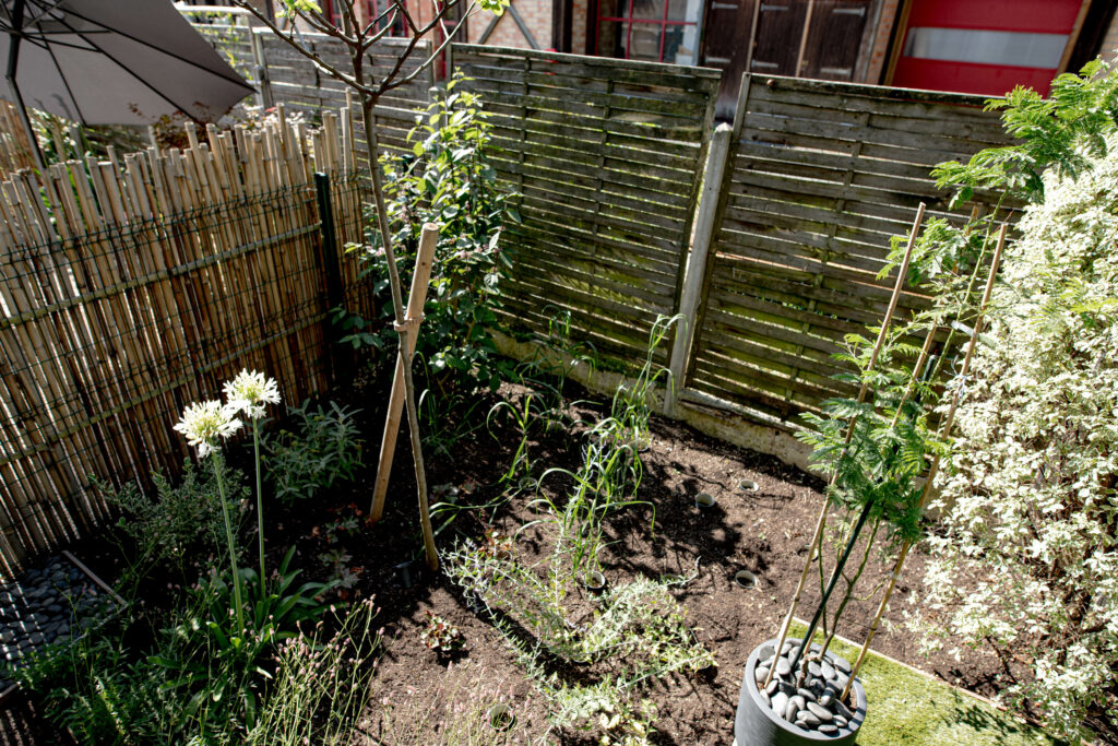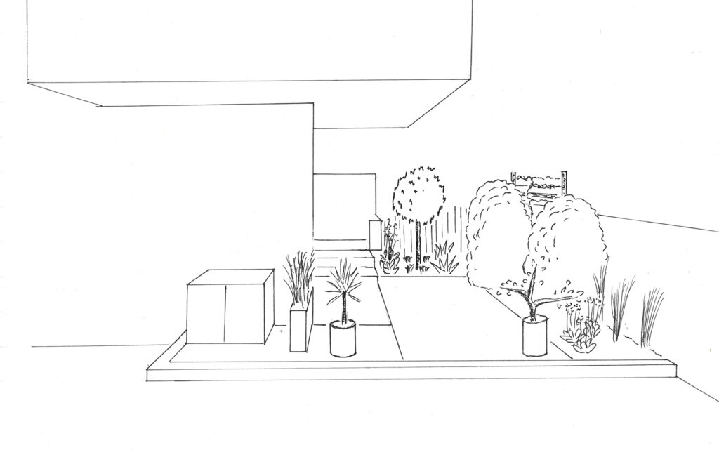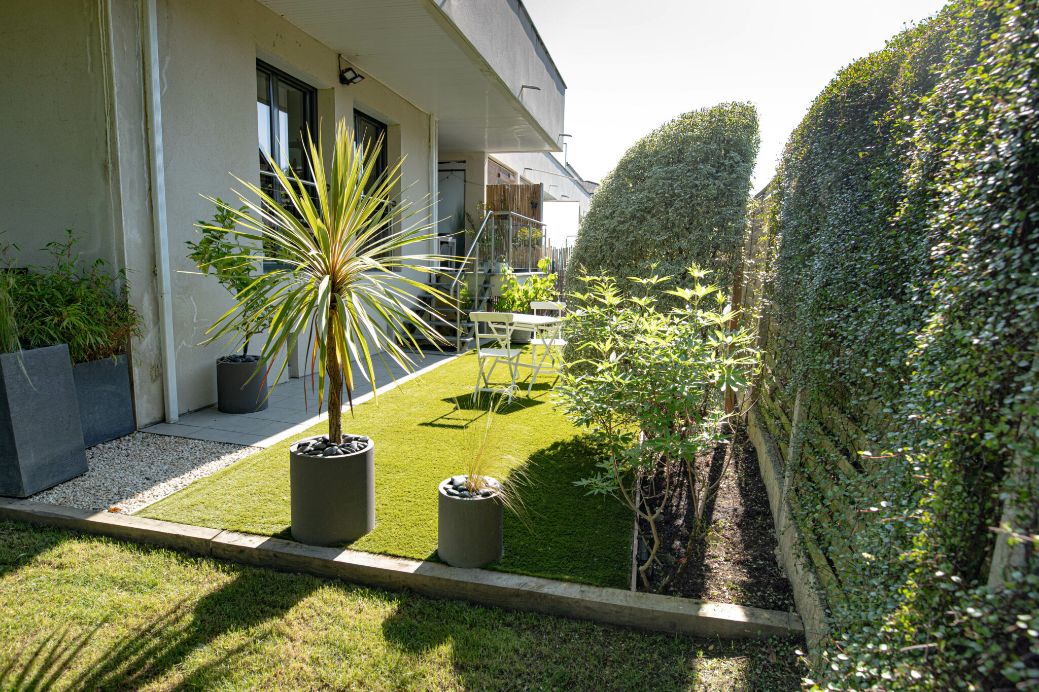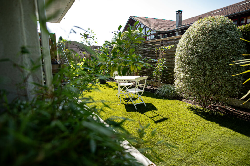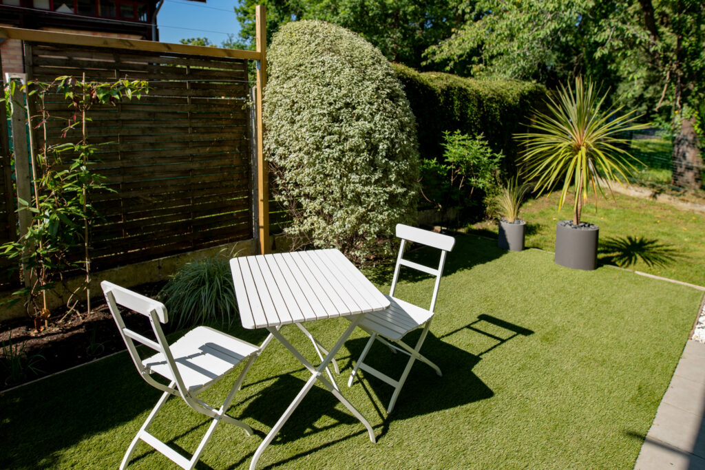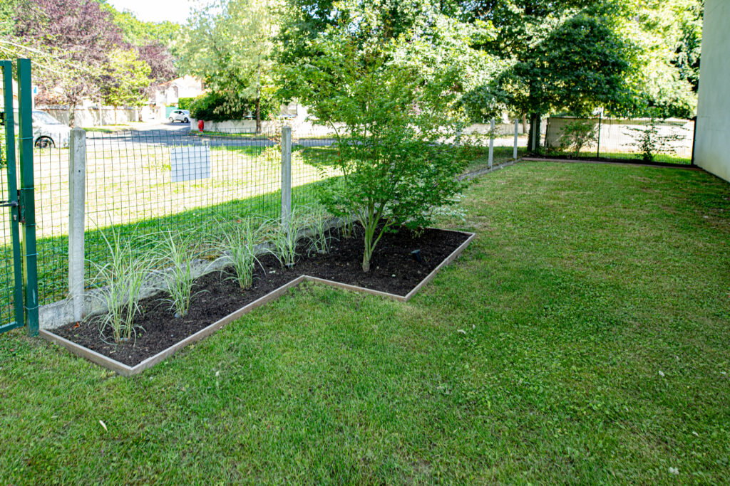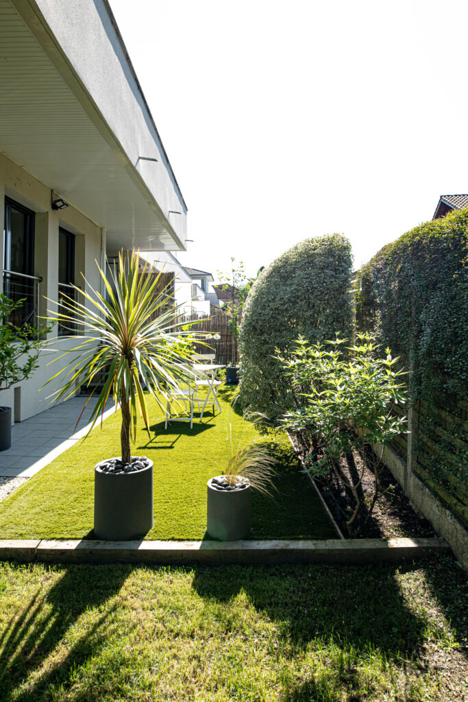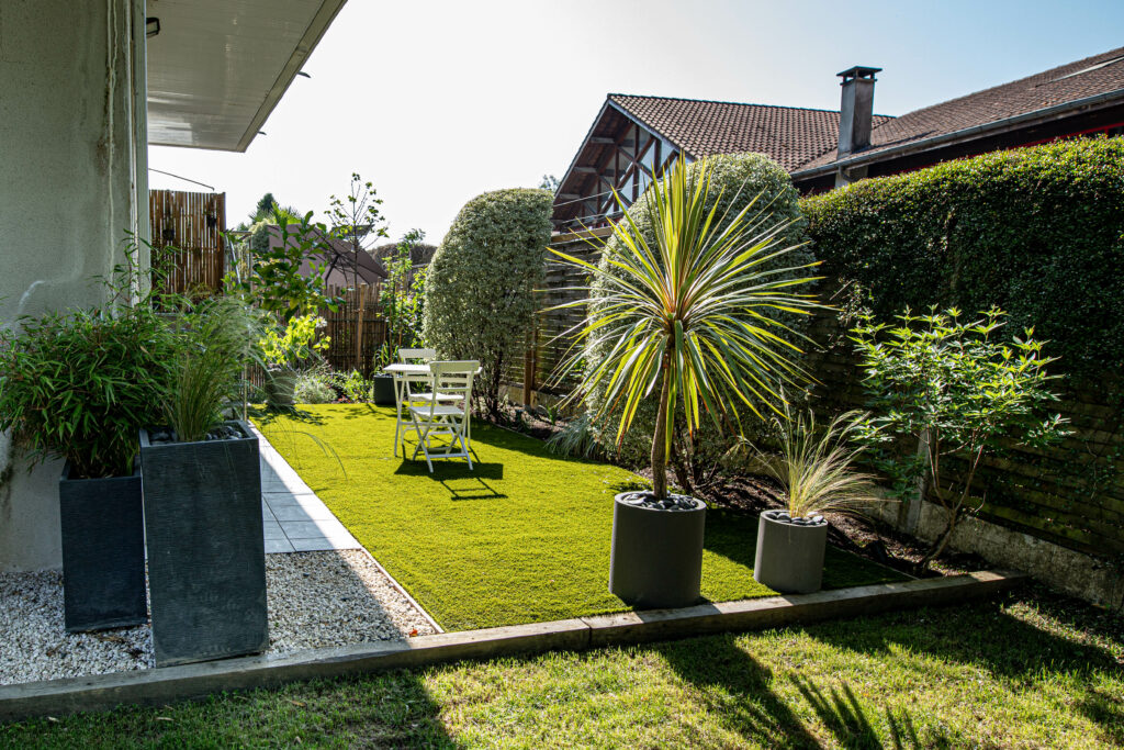 Conception et réalisation d’un jardin de 150 m2. Mise en place d’un gazon synthétique, plantation et éclairage des massifs